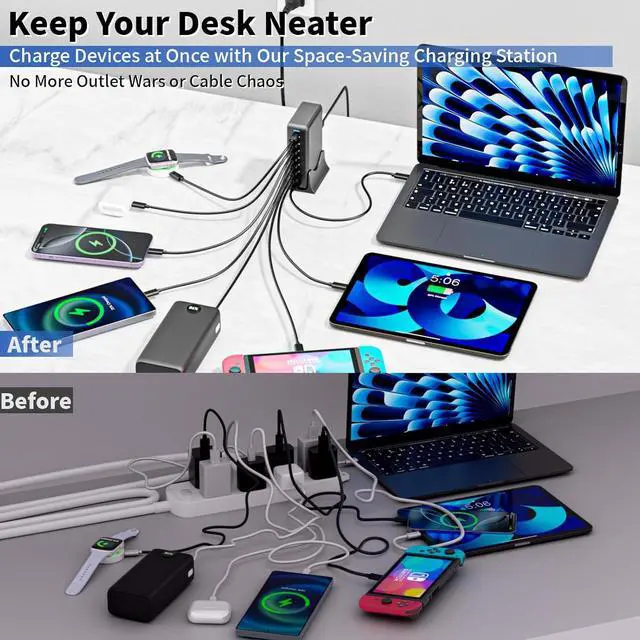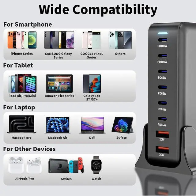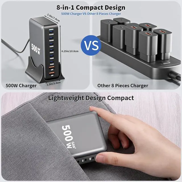 without worrying about distance limitations. Universal CompatibilityThe 500W USB C charging station supports PD 3.0 /PPS QC PE 2.0 AFC FCP SCP fast charging protocols and is compatible with Macbook Pro/Air Surface XPS iPhone 17/17 Air/17 Pro/17 Pro Max/16/15/14/13/12/XS/XSMax/XR/X/11/ProMax/SE2020/8/7/6/6sPro/Pro Max Series iPad Pro Series/ iPad Mini Series/ iPad Air Series Steam Deck Game Consoles Smartwatchs etc. What You Get1 x 500W 8Port(6*USB C+2*USB A) Charger Station 1 x charger stand 1 x Power Cord and Manual. Please contact us anytime if you have any problem with the product usage.