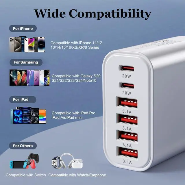 Portable and Compact Design: Ultra-compact size for enhanced portability. Convenient to carry and use anytime anywhereperfect for home office travel and frequent trips. You will receive a 6-port charger (cables not included). Ensure cables are securely connected to the charger ports during use to prevent charging failures caused by poor contact.
