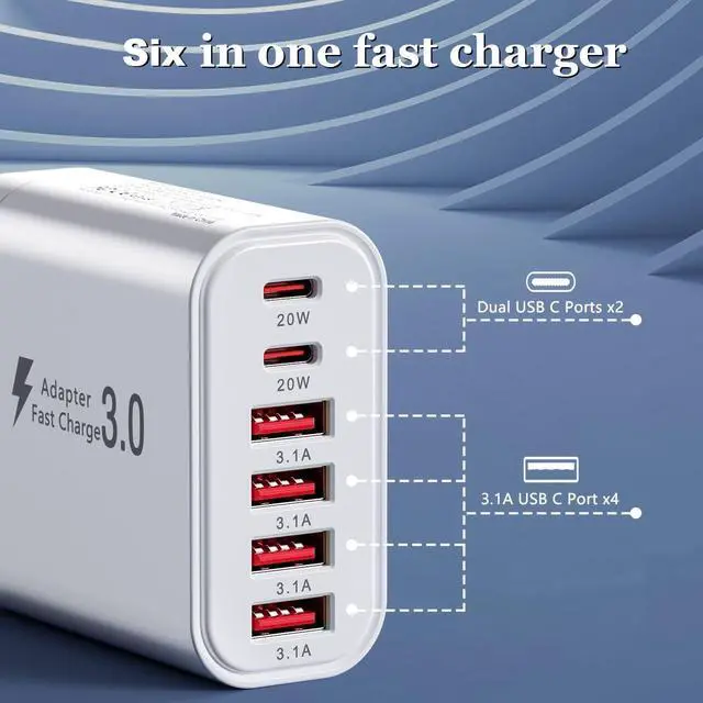 Charger Block: Our charger features six charging ports including two 20W Type-C ports and four 3.1A USB charging ports. When all ports are in use the total power output reaches 50W. This design accommodates simultaneous charging for multiple devices minimizing wait times.