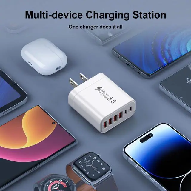 USB-C Multi-Port Charger: Newly upgraded designthis all-in-one wall charger simultaneously powers your phone tablet headphones smartwatch e-reader and Bluetooth speaker minimizing wait times. Not recommended for laptop charging as the output power supply does not meet laptop requirements. Charging speed will decrease when all 6 ports are in use simultaneously.