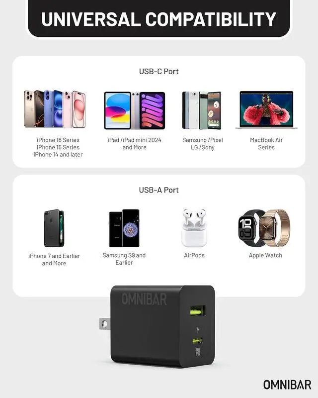 35W PD FAST CHARGINGThis iPhone charger fast charging supports the USB-C Power Delivery (PD) fast charging protocol providing up to 35W of charging power when used alone significantly boosting charging speed. Brings your iPhone 17/16 or Galaxy S26/S25 from 0 to 50 percent in about 30 minutes. DUAL-PORT DESIGN (USB-C+USB-A)Equipped with both USB-C and USB-A ports this USB C wall charger block allows for the simultaneous charging of two devices enhancing charging efficiency. When both ports are used together up to 15W of charging power is delivered by each satisfying the demands of charging multiple devices at once.