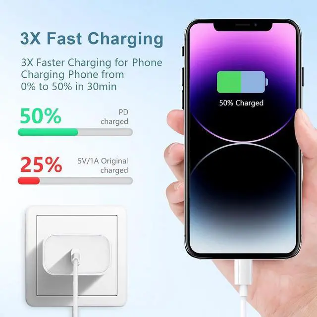 3X Fast ChargingThe USB-C port PD fast adapter wall charger and 6FT USB C to lightning fast charging cords That is it will charge your iPhone up to 50% power in just 30 minutes which is 3 times faster than the traditional 5W charger only takes 1.8 hours to charge your iPhone fully to save 1.5 hrs more time for you! MFi Certified for iPhone