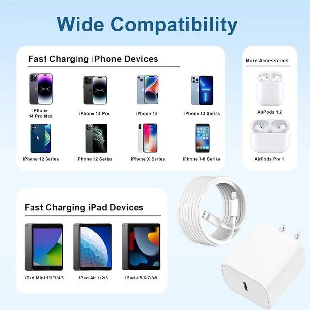 Superior Safety Fast Charging: Lightning charger has multipotent safety system ensures complete protection for your lightning devices; iPhone fast charge built-in over-voltage protection features a stable voltage. the lightning cable built-in smart chip to match the current required by devices automatically. Wide Compatibility Our USB C Wall Charger with USB to Lightning Cbale compatible for iPhone14/14 Plus/14 Pro/14 Pro Max13/13 Mini/13 Pro/13 Pro Max/12/12Pro/12 Pro Max/12 Mini/11/11 Pro/11 Pro Max/SE 2020/XS Max/XS/X/XR/8 Plus/8 Pad Pro/Pad Air/ Pad. Whether you need to charge your phone or tablet this charger is capable of delivering a reliable and stable power supply for all your devicesWhat You Get2x fast charger for iphone 14 13 and 2x 6 FT long phone charger cord. If you have any questions don't hesitate to contact us! We promise to solve your problemsNOTICE: Please do not use non-original on-board adapters in the vehicle Please do not charge for a long time in a high-temperature environment Please do not bend the cable excessively as this may cause a short circuit