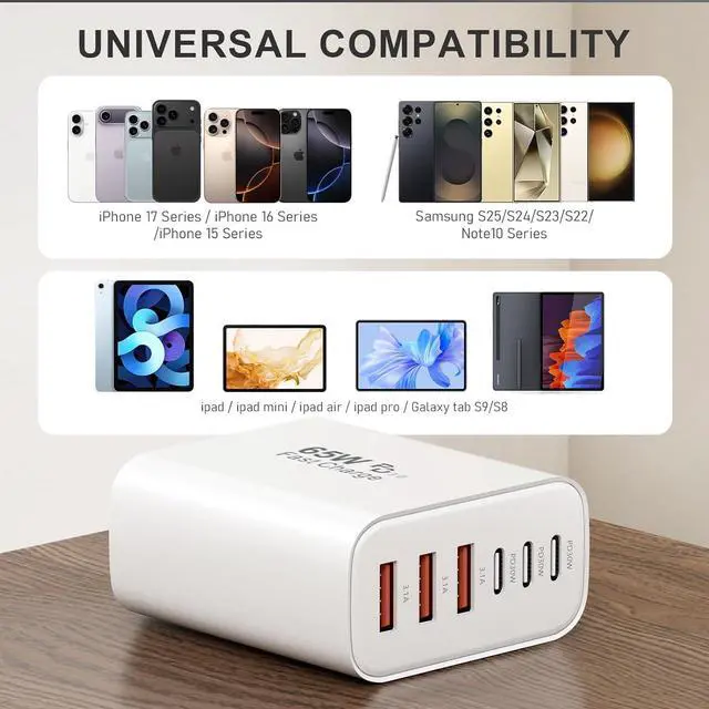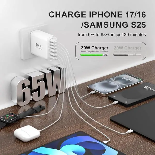 Universal Compatibility: One charger for all the c type charger block great compatible for iPhone 17/17 Pro/ 17 Pro Max/17 Plus/16/16 Pro/ 16 Pro Max/16 Plus/15/15 Pro/ 15 Pro Max/15 Plus/14/14 Plus/14 Pro/14 Pro Max/iPhone 13/13 Pro Max/iPhone 12/12 Mini/12 Pro/12 Pro Max /XR/XS/X/8/7 Galaxy S26/S25/S24/S23/S22/S21/S20/S10/S9/A12/ LG Moto and more. Safety & ReliableThe Charger block has multi protection safety system protect your devices from over current over voltage short circuit and overheating ensure charge your device safety and longevity. What You Will Get2*65W 6 Port charging block with worry-free 18-month warranty and friendly customer service. If you encounter any problems in using the charger block please feel free to contact our professional customer service team and we will offer friendly customer service within 24h.