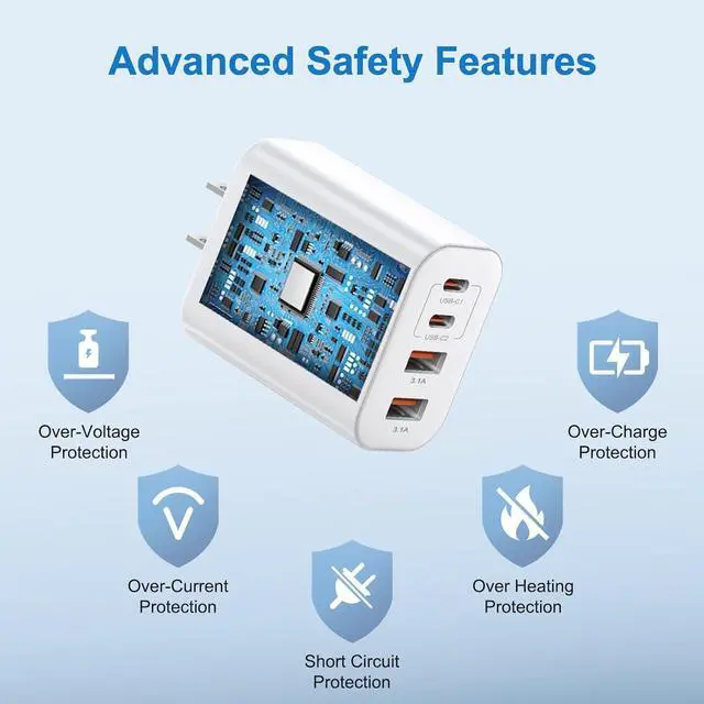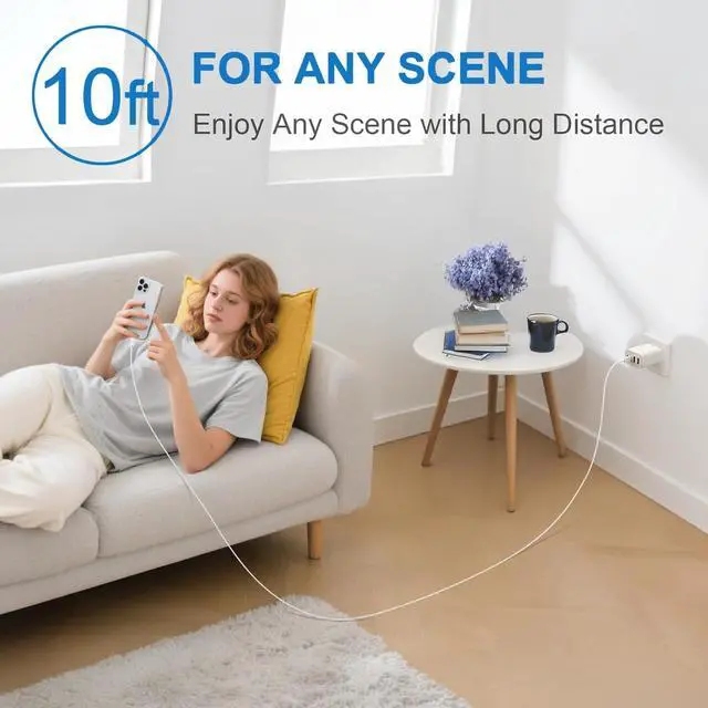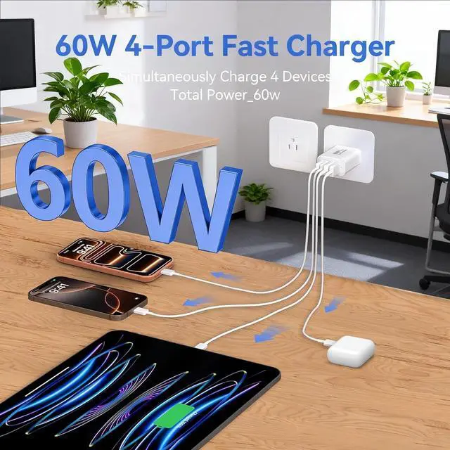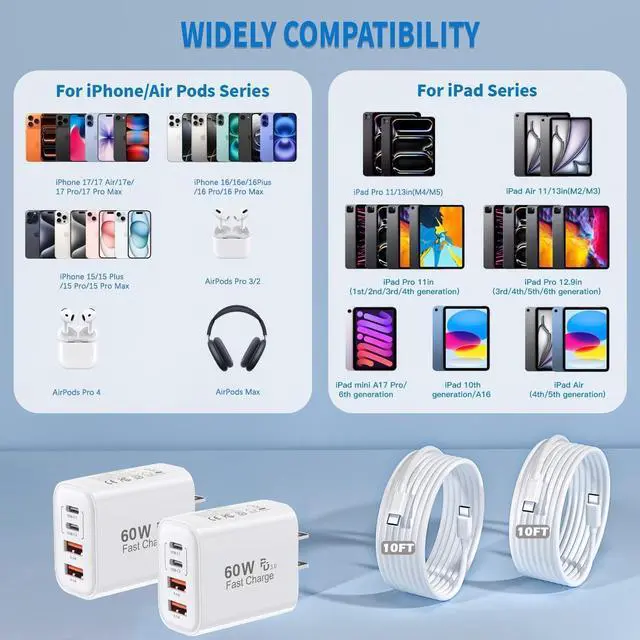 It also features multiple built-in safety protection measures to safeguard your device from damage caused by short circuits over-current over-voltage over-heating and over-chargingNew iPhone USB C Charger Universal Compatibility60W USB C fast charger compatible with iPhone 17/17 Pro/ 17 Pro Max/Air/17e iPhone 16/16 Plus/16 Pro/16 Pro Max/16e iPhone 15/15 Plus/15 Pro/15 Pro Max iPad Pro M5/M4/6th/5th/4th/3rd iPad Air M3/M2/5th/4th iPad A16/10th iPad Mini A17 Pro/6th Galaxy S26/25/S24/S23 Pixel 10/9/8 Tablet Android Phone and more USB C deviceWhat You Will Get2Pack 60W 4 port charger fast wall charging block with 2Pack extra long 10FT type c to c cables. If you have any questions don't hesitate to contact us.