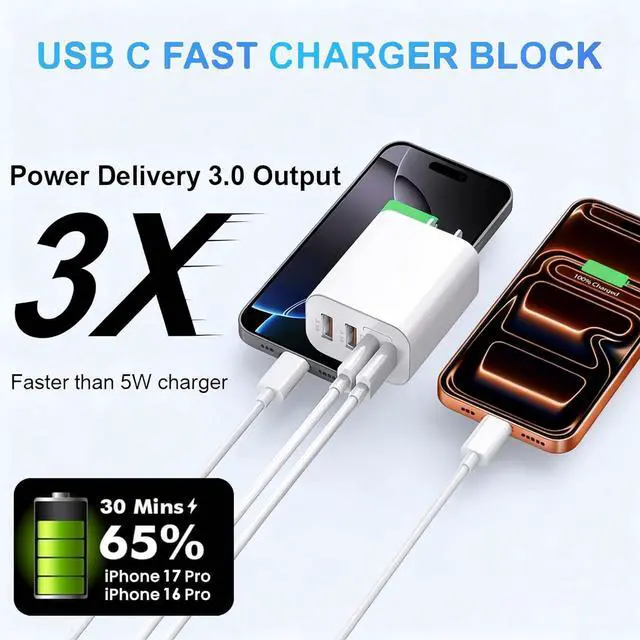 60W iPhone 17 Super Fast ChargerThe USB C fast charger block offers 60W Max charging speeds charge for iPhone 17 Pro up to 65% with in 30 minutes. 4-Port design include 2 USB-C port and 2 USB-A port provide consistent and convenient charging for your two devicesDurable 10FT USB C iPhone 17 Charger Cable CordIncluded 10ft USB C to USB C charger cable supports PD 3.0 fast charging up to 60W and 480Mbps data transfer. The reversible design ensures easy connectivity while reinforced joints and tangle-free construction enhance durability for daily useSafety & ReliableThis 60W GaN fast charger adopts market-leading GaN technology reducing charging time by 30% and temperature by 60%.
