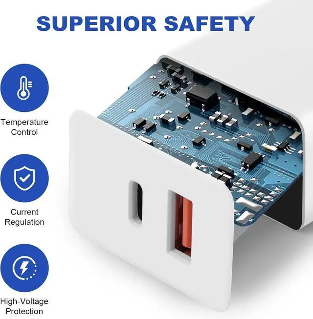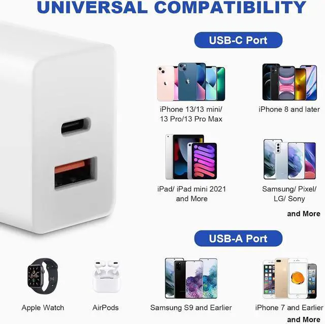 USB-A output: 5V=3A 9V=2A 12V= 1.5A; simultaneous use of two ports total output 20W MAX can intelligently allocate output power to protect battery life. Safety & ReliabilityThe charger block passes UL safety standards and protects your devices from overcurrent overvoltage overheating overcharging and short-circuit hazards. Equipped with a smart chip it can intelligently distribute the output power. CompatibilityProvides 20W full-speed charging. Compatible with iPhone17/16/15/14/13/12/11/XS/XR/X/8 iPad iPod smartphones headphones tablets Galaxy and other USB devices. What You Get You will get 2 pack of Dural Port USB Quick Charger Blocks. Enjoy 365 days of free returns and 24/7 customer service.