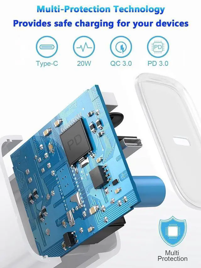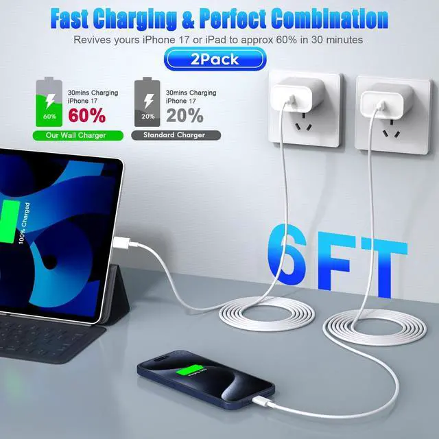 ? 6 Foot Long USB C to USB C Cable6 ft/ 1.8 m long iPhone 17 charger fast charging block usb c cable ensures 100% compatibility with your new iPhone 17/iPhone 16 devices tangle-free 6 feet length is convenient for usage while charging and syncing at home/office/travel in bed hotel rooms and more. with smart ic this iPhone 17 pro max charger will match its current required by the device automatically charges your iPhone/iPad device fast safely and steadily.? Safe and Reliable Charger for iPhone 17USB C wall charger built-in intelligent chip automatically identifies the required current of the device providing multiple protection over-charge protection over-current protection over-voltage protection and high-temperature protection for the device providing fast charging and protecting the safety of the device? What You Get2 Pack 20W USB C Charger Fast Charging Block 2 Pack 6FT USB C Charger Fast Charging Cable