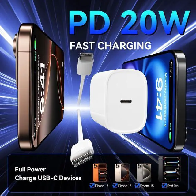 ? iPhone 17 16 Charger Fast ChargingiPhone 17 power delivery fast charger support fast charging technologies It provides fast-charging up to 20W output. Enjoy 4X fast charging speed than an ordinary charger. Charge your iPhone 17 Pro Max fully in just 1 hours Charge your iPad Pro 13 fully in just 2.5 hours Greatly improve your charging efficiency.? Wide Adaptability20W fast charging for USB C Charger for iPhone 17/iPhone 17 Pro/iPhone 17 Pro Max/iPhone Air/iPhone 16/iPhone 16 Plus/iPhone 16 Pro/iPhone 16 Pro Max/iPhone 16e/iPhone 15/iPhone 15 Plus/iPhone 15 Pro/iPhone 15 Pro Max iPad 11-inch (A16) iPad Pro 13-inch/11-inch M4 iPad Air 13-inch/11-inch M3 iPad Air 13-inch/11-inch M2 iPad Pro 12.9 -inch 6th/5th/4th/3rd 11-inch 4th/3rd/2nd/1st iPad Air 5th/4th iPad Mini 7th/6th iPad 10th Galaxy S25/S24/S23/S22/S21 Ultra/Plus.