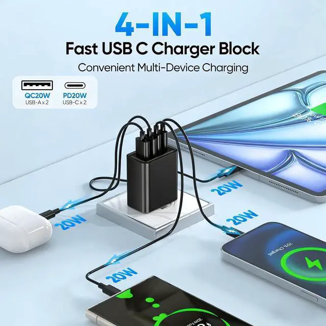 USB Wall charger: This upgraded wall charger features 2 USB-C and 2 USB-A ports replacing four individual adapters to charge four devices at once while saving space. Charging speed is increased by 3 times - upgrade from the old 5W charger to deliver up to 3 times faster charging. Smart power distribution ensures optimal charging for all connected devices minimizing wait times perfect for smartphones tablets earphones and more. Buy now and start all your devices immediately.