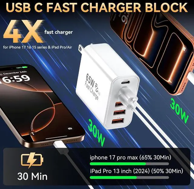 2-Pack 65W Fast Charger Block for iPhone 17 16 15 pro max6-port usb c Wall Charger block featuring 3 USB-C ports and 3 USB-A ports for efficient charging The PD 3.0 USB-C port delivers a maximum power of 30W the QC 3.0 USB-A port provides a maximum power of 18W and the total combined power output reaches 65W. Usb c charging block offers fast and efficient charging up to 4X faster than a standard charger block. Charge for iPhone 17/16/15/14 series devices from 0% to 65% in just 30 minutes. Super Fast Multiport Charger Block USB C6-in-1 Upgraded USB-C Power Block with 3 USB-C ports and 3 USB-A ports.