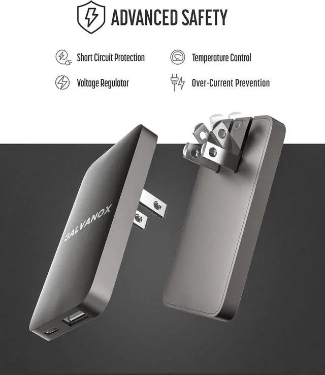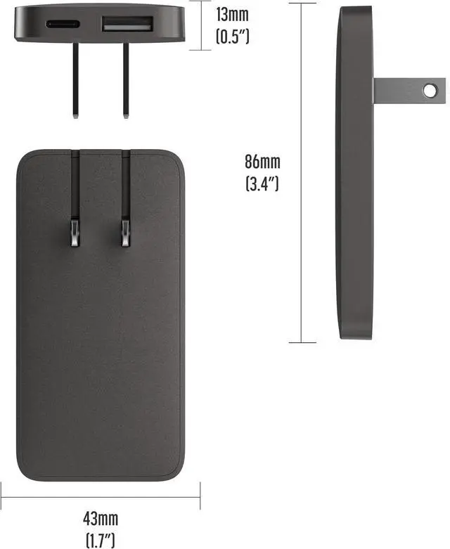 The overused term Ultra-Slim doesn't do this charger justice. Measuring under 1/2 an inch thick this charger is borderline 2-D! Features both USB-A and USB-C ports for fast-charging virtually any iPhone or smartphone. Great for use behind beds furniture and anywhere a compact profile is needed. The smart space saving design leaves full access to other neighboring outlets. With the prongs folded the charger easily fits inside purses or pockets making it the perfect travel companion.