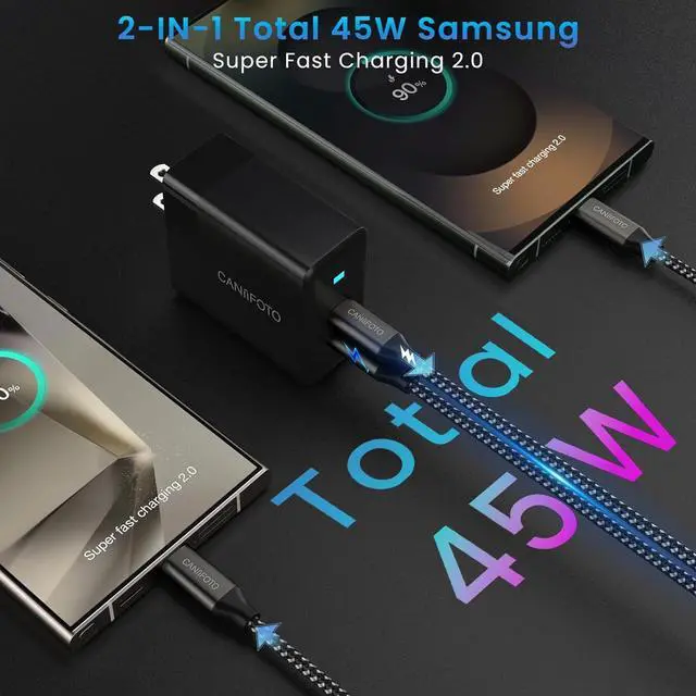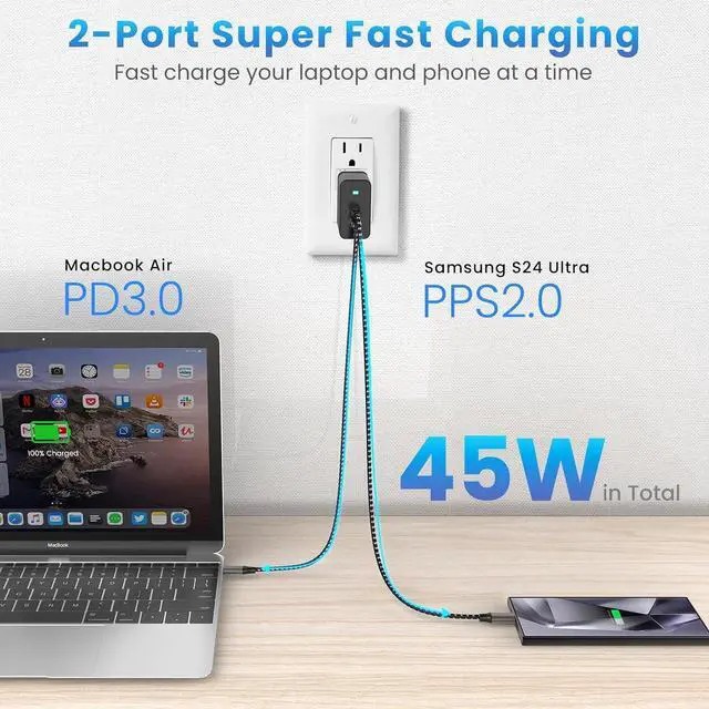 Charger 2.0: Equipped with 2X 45W PPS/PD 3.0 USB-C port 2-port 45w USB-C charger support Super Fast Charging 2.0 to provide compatible devices with maximum power of 45W. For fast charger type c can provide full-speed charge up to 50% within 20min for new S25 S26Ultra full charge from 0% takes less than 1h allowing you to power up your phone for series at unprecedented speeds. Say goodbye to long waiting times and hello to instant power. 2-Port Super Fast ChargingAdopt dual-channel independent output technology that enables total 45 watt fast charger type c to effortlessly deliver simultaneous a combined 45W of power from 2 ports without compromising power efficiency in the slightest. Whether it's your phone tablet or even your notebook super fast charger type c 45w Kit has the power to simultaneous handle them all without any slowdowns. 2X 6.6FT