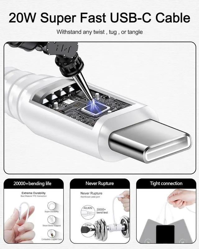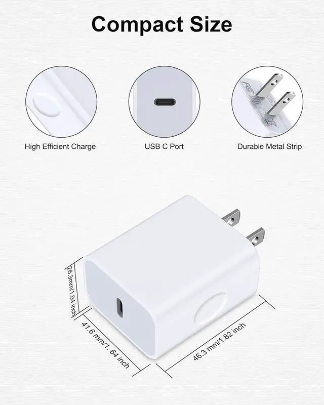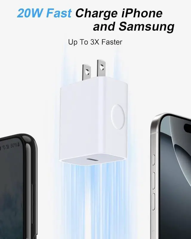 20W High-Speed Power20W usb c charger block with Upgrade PD 3.0 technology can rapid charging for iPhone 17e/16/16e/16Pro Max/15 up to 50% in just 30 minutes only takes 1 hour to charge your Phone fully save more than 40mins for you 3X faster than original 5W charger6FT Long USB C CableThis iPhone 17e charger cable can support full-speed charging and 480 Mbps data transfer speed. 6foot long length cable can be used to charge your devices at home/office/travel in bed sofa or car and more which makes your life more convenientWidely CompatibilityFast 20w usb-c power adapter for iPhone 17e/17/17Pro Max/16/16Plus/16e/16 Pro/16 Pro Max/15/15 Pro/15 Pro Max/15 Plus iPad Pro 13''/ 12.9 '' 6th 5th 4th 3rd gen iPad Pro 11'' 4th 3rd 2nd 1st iPad Air 6th 5th 4th iPad Mini 6 iPad 10 also provide high-speed charging for Galaxy S26 S26 Ultra S26+ S25 S25 Ultra S25+ S24 S23 Ultra S22 S21 A17 A16 A15 A56 A55 A26 Google Pixel 10 9 Pro XL 9 9Pro 8 7 Pro 6a 5 4XL and more USB-C deviceFlexible & DurableThis type c charger cable power cord is made of premium TPE material and a bulletproof fiber core it can withstand up to 20 000+ bends which has excellent resistance to wear this makes it more durable and flexible than cablesSafe & ReliableThe type c charging block wall plug bulit-in multi-protection system Upgraded smart chip can automatically match the current and stop when the battery is full.