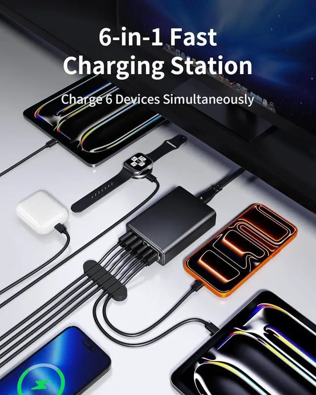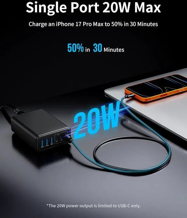 ? 6-in-1 Charger for AllTailored for today's tech-savvy users this charger is capable of powering all your gadgets simultaneously from Tablets to smartphones.? High Power Quick ChargeEffortlessly charge your MacBook Air to 50% in just 1 hour and 40 minutes or rapidly power your iPhone 17 Pro Max from 0 to 50% in just 30 minutes using a single 20W max charging port.? 105W Multi-Device ChargerFeaturing 3 USB-C and 3 USB-A ports this charger delivers a total output of 105W providing ample power to charge multiple devices at once.? Tidy Desk Tidy MindOrganized Workspace Clear Mind.