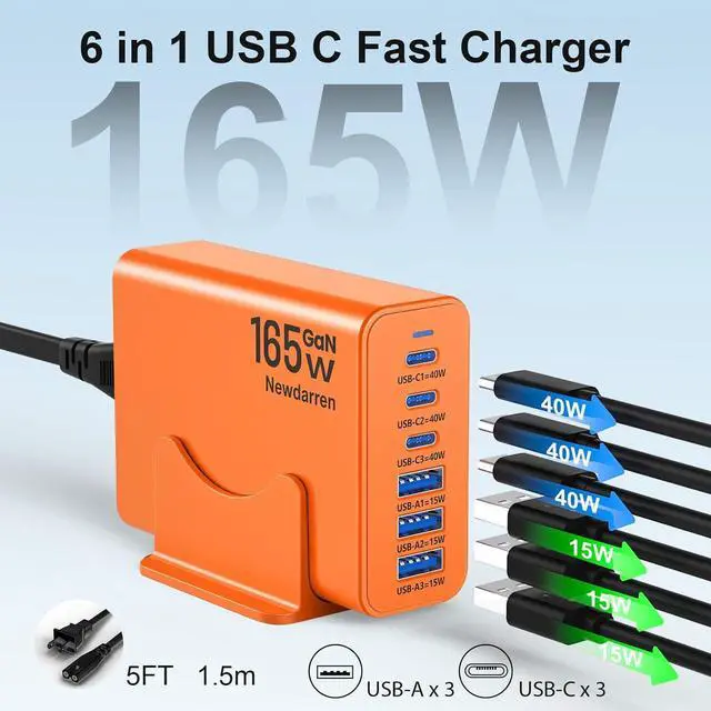 Ultra-Fast Desktop Charging StationGet Your iPhone 17 To 50% In Just 25 Minutes. This 6-In-1 Charging Hub Features 3 Usb-C Ports (40w Max Each) and 3 USB-A Ports (15w Max Each) With A Combined Output of Up To 165W. Charge Six Devices SimultaneouslyLike Your Smart Watch Earbuds hand Fan Power Bank and MoreWith No Waiting. Universal CompatibilityWorks With a Wide Range of Devices Including iPhone 17/16/15/14/13/12/11 Pro Max X/Xr/8 Plus iPad Pro/Air/Mini Galaxy S/Note/Z/Tab Series Switch Speakers Lamps and Laptops. Compact and PortableMeasures Just 3.6 × 2.3 × 1.2 InchesSaves 50% Space Compared To Bulkier Hubs.