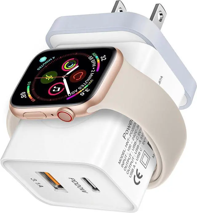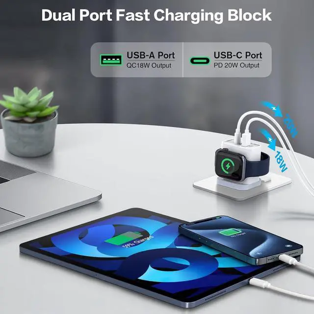 Charger for A-pple Watch Upgraded cordless charger block for A-pple Watch series with advanced wireless charging coils no extra cables need and you can direclty charging for your iWatch in home office travel. Dual Port Fast Charging Block USB C Fast Charger with 20W Type-C PD port + 18W USB- A port up to 20W Max output charge for you phone to 50% battery in 30 mins meets your daily charging needs and free you from messy chargers.