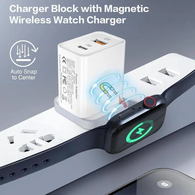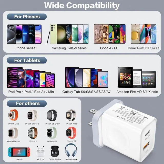 (Note: If 2 ports are used at the same time the output of each port will not be greater than 5V/2A single port will offer faster charging speed)3-in-1 Portable USB C Wall Charger Portable Dual Port PD Wall Brick consists of a USB-C port a USB-A port and wireless A-pple Watch Charging coils allows you to easily charge different devices simultaneously free from confusion and take little space for carry it! Wide Compatibility USB C Charger with dual port and wireless charger charger brick compatible with iPhone 15 14 13 12 11 Pro/Pro Max/Mini/X/8 for and Android tablets. wireless charger for A-pple Watch series. you can charge for 3 devices simultaneously. Compact & Safety ProtectionUSB Charger Block with smart chip avoid over-charge over-current over-voltage and over-heating Intelligent protect your devices. If you you have any problems or questions we will help you in 24hrs.