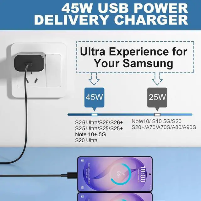 45W Super Fast Charger45W USB-C Fast Charger Block adopts latest PPS (Programmable Power Supply) fast charging technology to provide maximum power of 45W charge up to 50% within 20 minutes for S26 S25/S24/S23/S22 Ultra USB C Fast ChargerThis 45W USB-C Charger set is broadly compatible with almost any personal devices from cellphones tablets to laptops provides optimized charging for phones [45W Super Fast Charging 2.0 ] for Galaxy S26/S26+/S25+/S25 Ultra/ S24 Ultra/S24+/S23 Ultra/S23/S23 Plus/S22 Ultra/S22 Plus/S20 Ultra/Note 10 Plus Galaxy Tab S8/Ultra/S7/Plus; [25W Super Fast Charging] for Galaxy S25/S24/S23/S22/S21/S21 Ultra/FE 5G/S20/Note 20/Note 20 Ultra/Z Fold 3 4Super Fast Charger Type C This 45 Watt super fast charging block multiple built-in safeguards protect your devices against damage caused by short circuit over-current over-voltage over-heating and over-charging issues.
