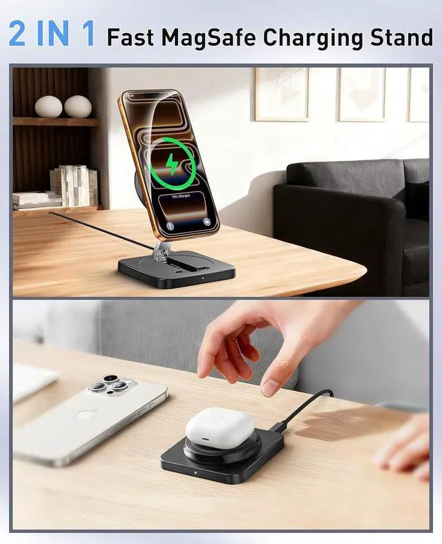 Adjustable and Space-Saving: Elevated charging pad protects iPhone cameras. The Featuring a foldable space-efficient design with angle-adjustable phone and watch charging modules can instantly transform into a cell phone stand. this mag-safe charging station allows you can be placed horizontally to watch movies and vertically to video chat. Portable Foldable Design for Travel & Office great option to organize your home office or travel