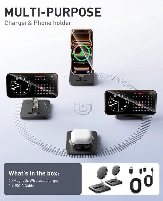 Packs Magnetic wireless charging stand: Double Set Combo Caring Doubled one for work and one for home seamlessly switch between iPhone and Android Plus share the convenience with your loved onedouble the satisfaction always with you. The package includes 2 pack 2 in 1 wireless charging station 2 pack c to c cable user manual 24 months warrantyStrong