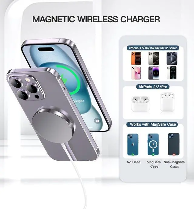 Up to 15W magnetic wireless charging pad is perfectly compatible with latest models 17 17Pro 17 Air 17 Pro Max 16 16Pro 16 Plus 16 Pro Max 15 15 Pro 15 Plus 15 Pro Max 14/13/12 series and AirPods 3/Pro/Pro 2.