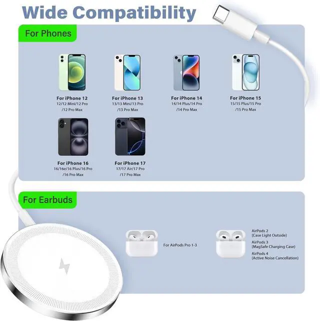 AirPods & Android Devices: Compatible with the full iPhone 17/17e/16/16e/15/14/13/12/11/X/8 Pro Max Mini Plus lineup AirPods 4/3/2/Pro with wireless charging cases Google Pixel 10/10 Pro/10 Pro Fold (no magnetic case required) as well as Galaxy S26/S25/S25+/S25 Ultra/S24/S23/S22 Galaxy Z Fold 7/Flip 7 Galaxy Z Fold 6/Flip 6 and Motorola Edge 50 Razr 50/60 (magnetic case required). Auto-align magnetic charging makes every top-up easy and effortless. )Powerful