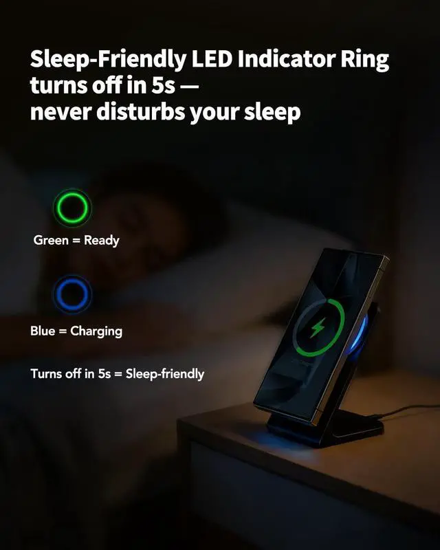 Sleep-Friendly LED That Truly Disappears: The soft LED ring shows charging status (green = ready blue = charging) then automatically turns off completely after just 5 seconds never too bright never disturbs your sleep. Perfect nightstand companion.?? Stable Stand for