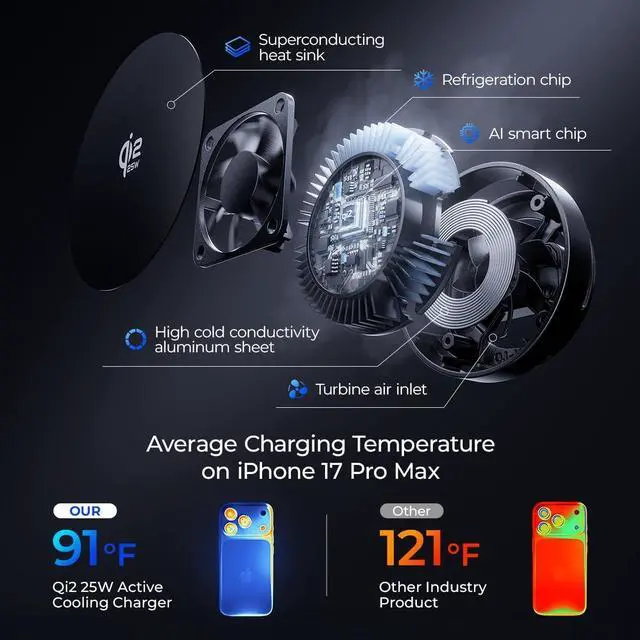 It is also compatible with Watch Ultra 11 10 9 8 7 6 5 4 3 2 & AirPods 2/3/4 Pro. Quiet & Sleep-Friendly DesignFeaturing a newly developed ultra-quiet motor this 5-in-1 magnetic charging station operates up to 20% quieter than conal cooling fans. Its near-silent performance won't disturb your sleep making it perfect for overnight use or quiet spaces like offices. Why Cooling Matters1. Sustained Performance Prevents slowdowns and charging limits caused by overheating. 2. Extended Battery Life Reduces heat stress on the battery to slow long-term degradation 3. Enhanced Safety Active cooling design lowers the risk of thermal runaway.