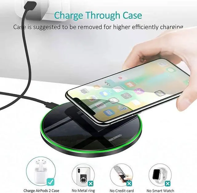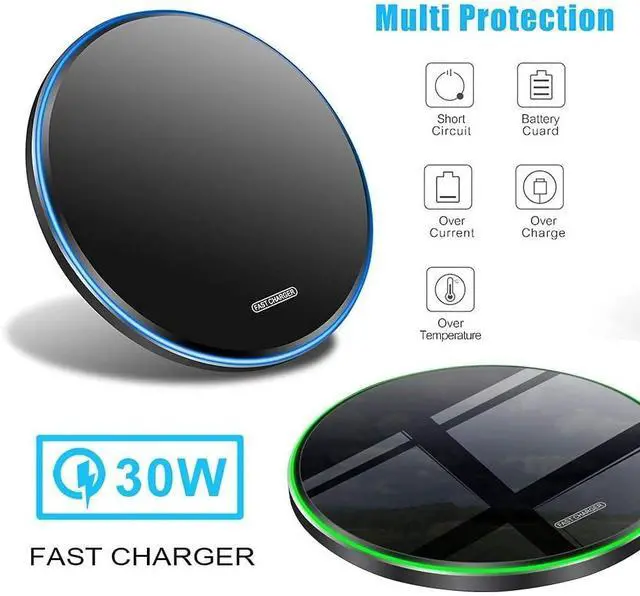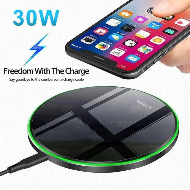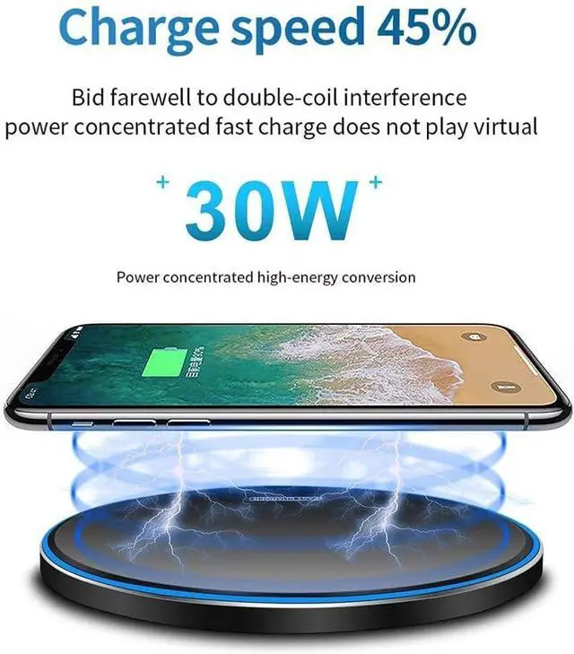30W Fast Wireless ChargerWireless charger 30W Works with the all wireless charger of phones including the latest Compatible with iPhones Galaxy phones and wireless earbuds. (30WMax/20W/15W/10W/ 7.5W (iOS) /5W). Case friendly The fast wireless charger allows you to charge your device at a higher charging speed which up to 1.8X faster than standard wireless charger. Don't fumble with your phone case. Inductive charging directly through protective cases up to 6mm/ 0.23 inch thick (not including cases with magnetic or metal attachments). Led indicator When the power is on the Blue light will be turn on for 3 seconds automatically turn off If the charging device is not detected In standby When you put mobile phone on to charging The weak blue light flashes slowly until it is fully charged.
