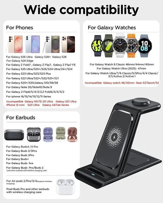 • Wireless Charging Station for Wireless Charger Galaxy S26 Ultra/S25/S24/S23/S22/Note20 Z Fold Flip7 Galaxy Watch 8/7/6/5/4/3 Active 2/1 Stand Galaxy Buds4/4 Pro/3/2 Pro/Live Multiple Devices