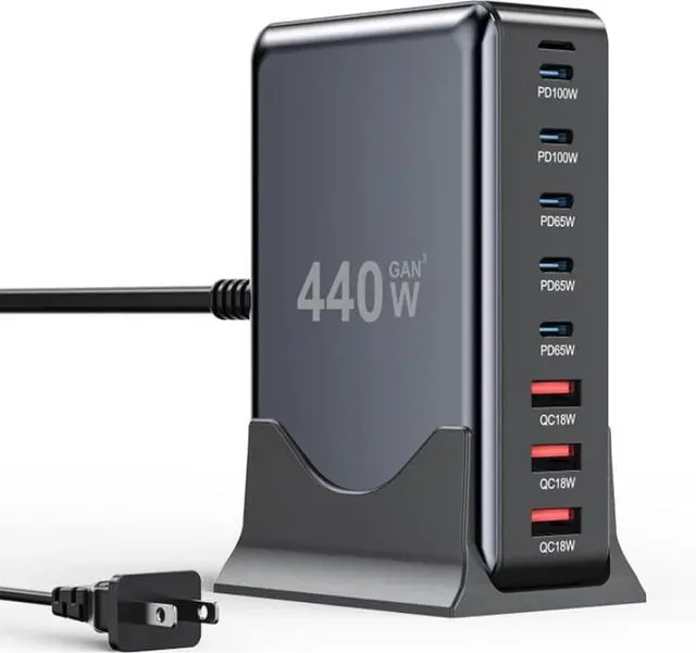 Ultra-Powerful 440W Charging StationExperience the convenience of high-speed charging for eight devices simultaneously with our potent 440W USB C Charger. Our USB C charger block with 5 USB-C ports and 3 USB-A ports Streamlining your charging process allowing you to power up all your devices simultaneously with ease. When a single device is connected to the USB-C1/C2 ports it enjoys an impressive charge of up to 100W. Universal Compatibility with up to 3000+ DevicesThis GaN charger is able to charge can fast charge 1 laptop 4 phones/tablets and 3 others at once. All ports support (quick charge) agreement its compatible for MacBook Pro/Air iPhone 17/16 iPhone 15/14 or previous models iPad Pro/Air Galaxy or previous models Google Pixel XPS Switch and more covering a whole family needs and save money&space.