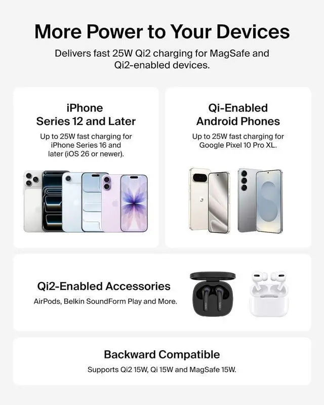 FAST CHARGE W/ THE LATEST Qi2 TECHNOLOGY: Conveniently fast charge your iPhone or Qi2 devices up to 25W on this magnetic charger. Fast charging is supported only on iOS 26 and newer not iOS