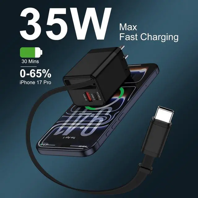 Charger Block: The 35W retractable phone charger has a USB A/C ports and retractable fast-charging USB C cable which can charge 3 devices at the same time. In just 30 minutes this galaxy S26 Ultra charger fast charger block your Galaxy S26 Ultra S26 Plus S26 S25 Edge FE up to 65% making it three times faster than the 25W charger. Whether it's phones earbuds or smartwatches this retractable wall charger meets all your power needs with ease. Universal Super Fast