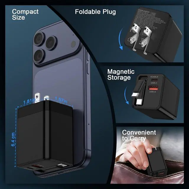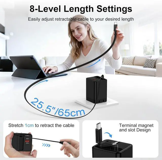 Charging Cable: The USB C charger block fast charger or c type charger fast charge 35w is with built in galaxy S26 Ultra charger cable PD charging cord. The USB-C connector offers a user-friendly reversible design fast Charging and transferring Up to 480 Mbps data transfer speed; power output up to 3Amp. The flexible and sturdier nylon braided c phone charger cord ensures longer service life and will never rupture. The maximum retractable length of the iphone charging cable is 80cm ( 31.50 inches) and it can be adjusted in 8 levels to meet different length requirements.