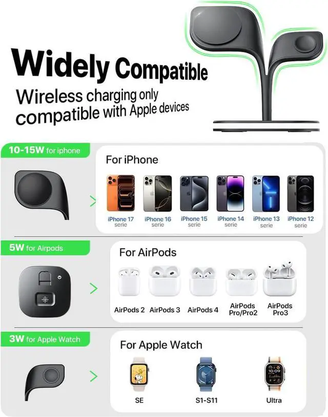 Unique Leaf Design: Inspired by the green leaves of nature the unique shape of this wireless charging station for will hopefully bring your convenience and keep you in a happy mood! This unique wireless charger compatible with magsafe charger is perfect. What You Will Get1* 3 in 1 Wireless Charging station +1*QC 3.0 Adapter (Please use the adapter provided or a QC 3.0 18W adapter for charging) + 1* User Manual+1 *Wireless Charger Guide; If you experience any quality problems with your wireless charger for iphone please do not hesitate to contact us! We will definitely give you a satisfactory answer Please do not visit support website.