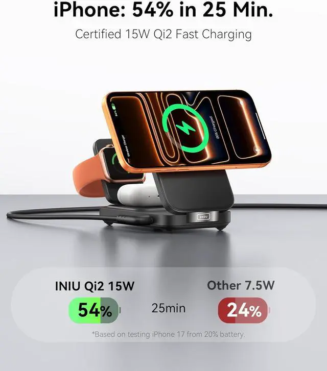 Fastest Charging Redefined: This portable mag-safe wireless charger offers Qi2-certified 15W compatible wireless charging for iPhone 16-12 series. It also ensures up to 5W fast charging for Watches capable of charging an Series 10 to 63% in just 30 minutes.