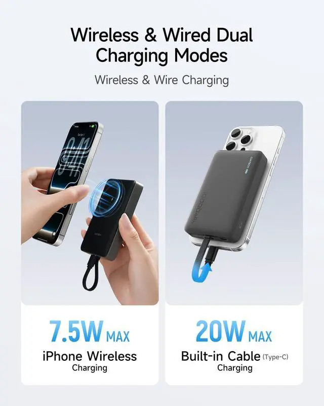 Charging Modes: Snap it on for 7.5W MagSafe-compatible wireless power or use the integrated USB-C cable for 20W fast wired charging meeting everyday wireless convenience and quick charging needs on the go. Strong 10N Magnetic Hold for