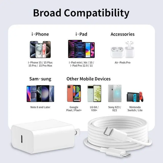 20W PD USB Type C power delivery wall plug PD adapter 3.0 Quickly Charge USB-C port provides Max 20W output power 3X faster than standard USB charger. charging your up to 80% in just 30 minutes for Pad Pro Charging At 3A Maximum 100% high-speed charge and 480 Mbps data transfer speed. Tangle-free 10 Feet length is convenient for usage while charging and syncing at home/office/travel in bed hotel rooms and more. This 20W USB-C Power??? Fast Charger Adapter Built-in Intelligent Power Management Chip can auto-detect iPhone 17 16 15 series device connected type-c port while also identifying the appropriate current to charging your iPhone 17 16 15.