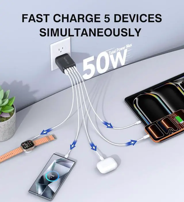 Charging Block: 5-Port PD Fast USB C Charging Block featuring 2 USB-C ports and 3 USB-A ports for efficient charging. This usb charging block offers Power Delivery and Quick Charge 3.0 technology delivering a total power output of up to 50W. The USB-A port provides 3.1A /5V output while the USB-C port offers a rapid 20W charging speed. It can charge your iPhone 16/15 devices from 0% to 50% in just 30 minutes. Ideal for charging iPhone iPad MacBook tablets5 IN 1 USB Charger Block with