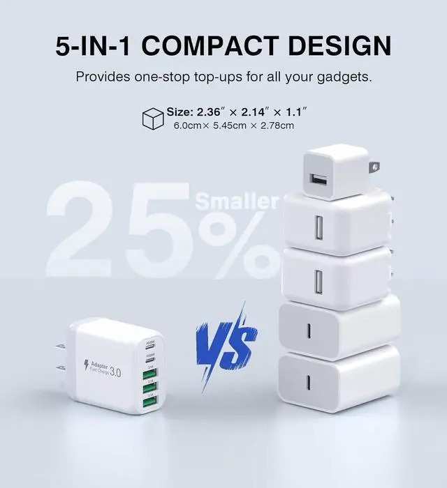 Compatibility USB C Wall Plug: This type c charging block compatible with All smartphones and tablets such as iPhone 17/17 Pro/17 Pro Max/16/16 Pro/16 Pro Max/16 Plus/15/15 Pro/15 Plus/15 Pro Max/14/14 Pro/14 Pro Max/14 Plus/13/13 Pro/13 Pro Max/13 Mini/12/12 Pro/12 Pro Max/12 Mini/11/11 Pro/11 Pro Max/XS/XS Max/XR/X usb c charger for iPad Pro/Air/Mini Watch10 AirPods4 usb a charger compatible for Galaxy Ultra2/S24/S23/S22/S21/S20/S10/S9/S7/A12/A13/A22/A32/A52/A53/Note 20 LG Google Pixel Kindle Wireless charger Tablets Switch etcCompact and Portable USB and USB C