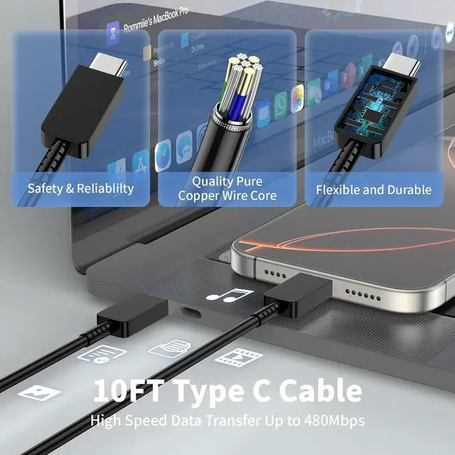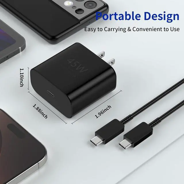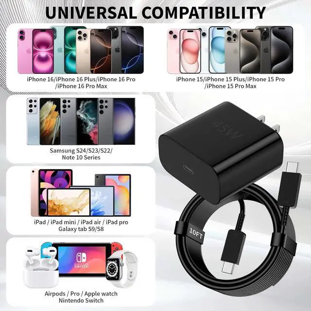 Pro: Equipped with Latest-generation Future-proof fast charging technology The 45W iPhone 16 Fast Charger USB C Block with USB C to USB C fast charger cable cord provide Max 45W output power charge your iPhone 16 Pro Max up to 65% in just 30mins 6X faster than the original 20W USB C charger10FT Long USB C to USB C Cord The iPhone 16 Pro Max Charger with 10 ft Long type c to c charging cable cord supports PD 3.0 fast charging speed max up to 20V/5A (100W) The cable's reversible design allows for effortless plug-in while enabling efficient 480Mbps data syncing. Tangle-free 10 Feet length is convenient for usage while charging and syncing at home office travel and more. Universal CompatibilityThe lezaface iPhone 16 USB C charger cable cord is perfectly compatible for iPhone 16/16 Plus/16 Pro/16 Pro Max/15/15 Plus/15 Pro/15 Pro Max New 2021 iPad Mini 6th iPad Pro 12.9 in 5th/4th/3rd iPad Pro 11 in 3rd/2nd/1st iPad Air 4th Galaxy S24/S24+/S24 Ultra/S23/S23+/S23 Ultra/S22/S21/S20/Note 20/Note 10 Pixel 7/6/5/4/3/2 XL and more usb c devices. Safe and Efficient Fast Charging Multiple built in safeguards with this 45W USB C Wall Charger with USB C to C Charger kit to protect your devices against damage caused by short circuit over-current over-heating and over-charging issues.