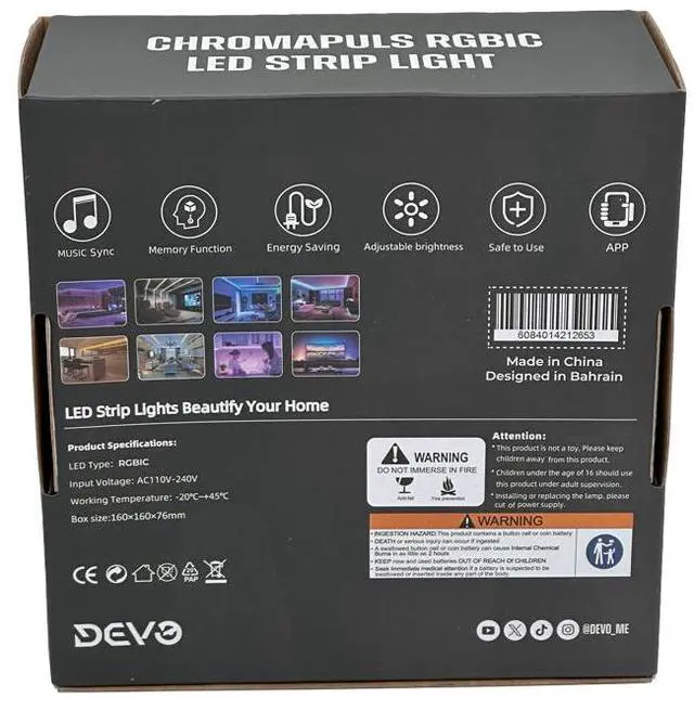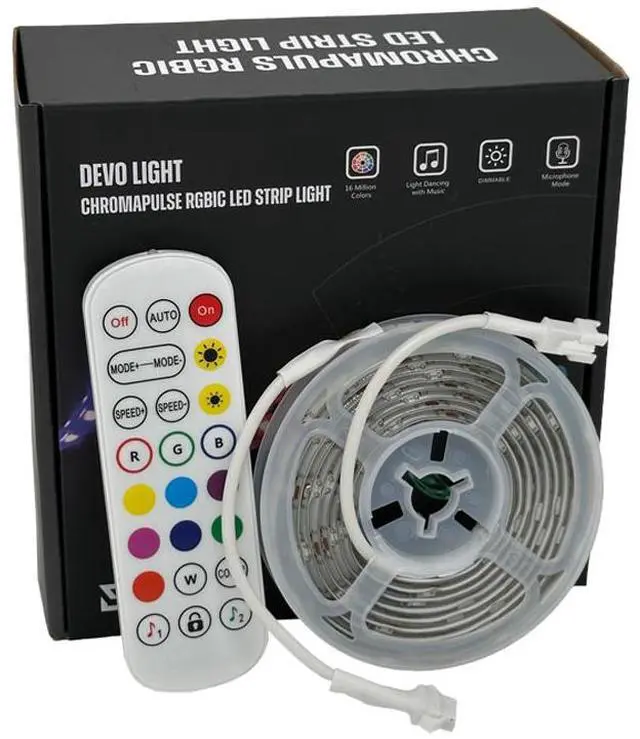 Transform your space with the Devo Light ChromaPulse RGBIC LED Strip Light, designed to deliver vibrant, customizable lighting for your gaming setup, home decor, or entertainment space. Featuring RGBIC technology, the ChromaPulse LED strip allows you to control each individual LED's color and effect, offering an immersive lighting experience that reacts to your environment.
