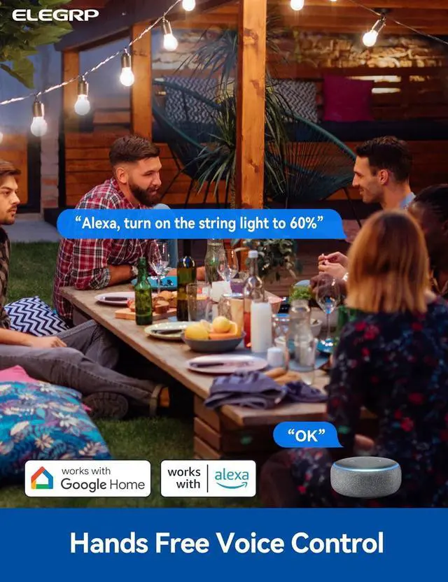 Smart APP & Voice ControlCompatible with Amazon Alexa and Google Assistant. Enjoy the hands-free convenience of controlling any outdoor electronic appliances with your voice via Alexa or Google Assistant. Turn electronics on and off from anywhere with your smartphone using the ELEGRP app, whether you are at home, in the office or on vacation.