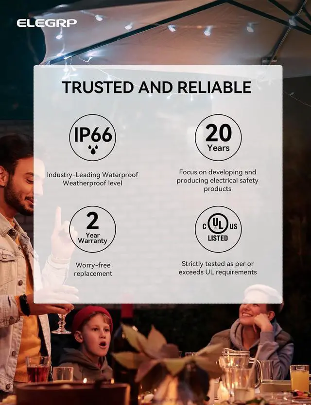 Impressive IP66 Waterproof RatingELEGRP smart outdoor plug is designed with IP66 waterproof housing and cover, no more worries about short circuits in heavy rain. Built to stand the test of harsh conditions like Cold, Heat, Moisture, and UV Rays from -20°C to 50°C. Perfect for patio string lights, landscape lights, holiday lights, pond or fountain pumps, and more. UL and FCC certified to protect your family's safety.