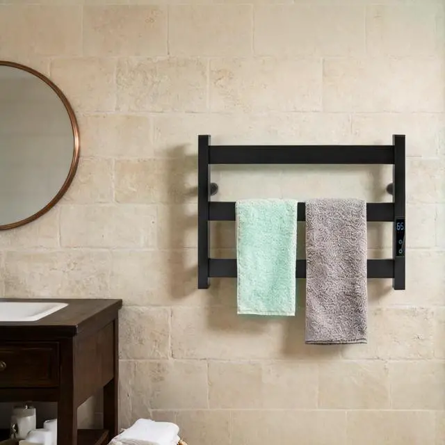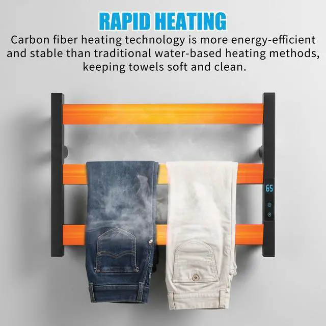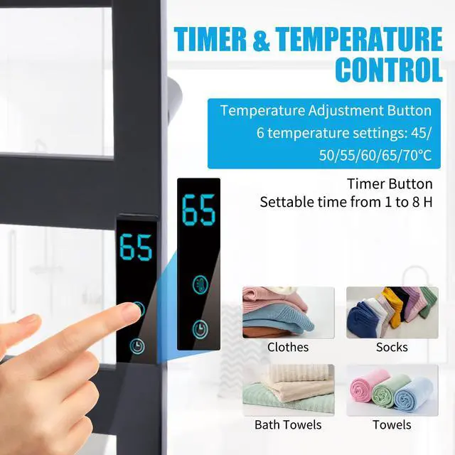 Temperature Control: This heated towel rack can be adjusted to six temperatures 45/50/55/60/65/70, which is intimate and intelligent, giving you an exclusive and comfortable temperature.