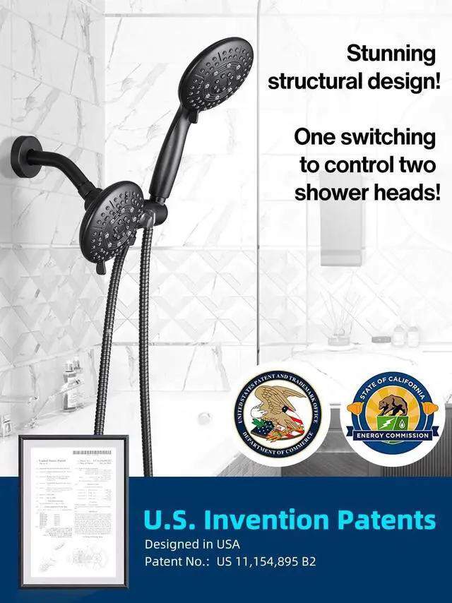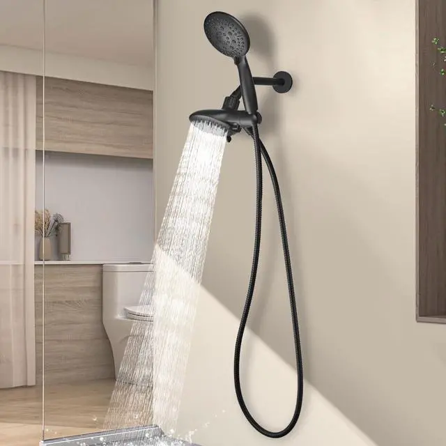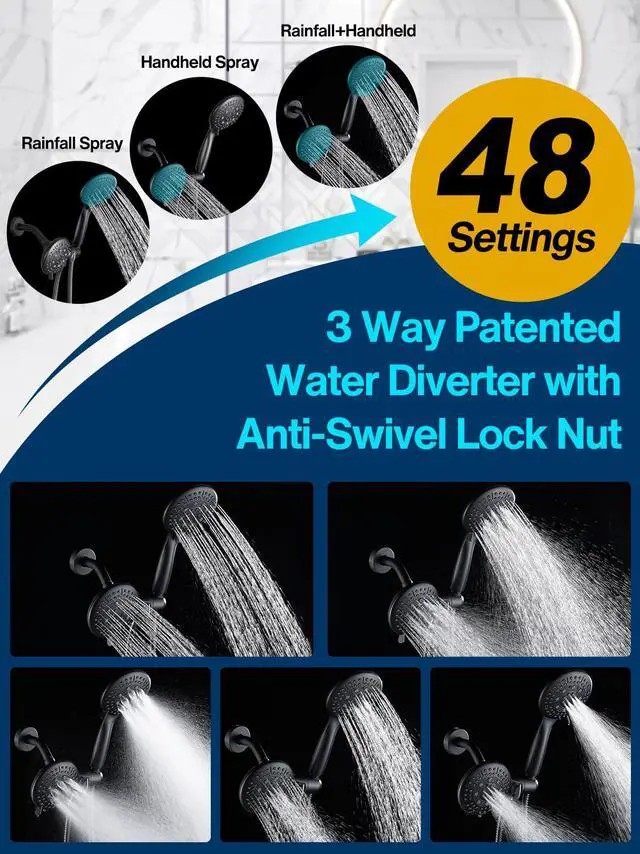 Dual Handheld Shower Head Combo, Powerful Water-Saving Shower System 2 in 1 High Pressure Rainfall Shower Combo 48-Setting 3-Way Water Diverter with Anti-Swivel Lock Nut, 6 Spray Mode