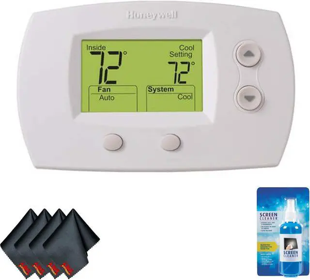 BUNDLE INCLUDES: Honeywell TH5220D1029 Focuspro 5000 Non-Programmable Thermostat, Screen Cleaning Solution, 4 x Microfiber Cloths. Large, Clear Backlit Digital Display - Easy-to-read in various lighting conditions. Precise Comfort Control - Maintains consistent comfort to the highest level of accuracy. Easy-access Battery Replacement - Flip-out door allows for easy battery replacement without removing or disassembling the thermostat. Dual-powered (battery and / or hardware)