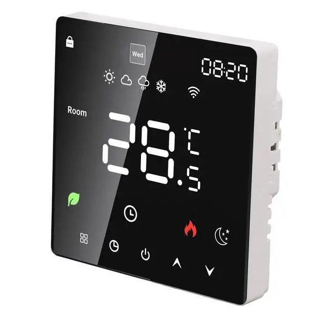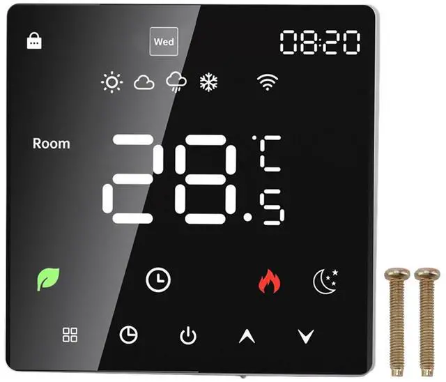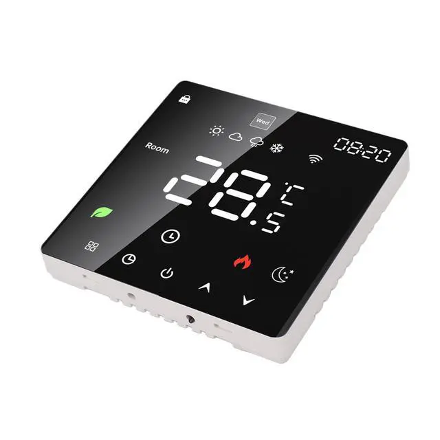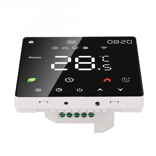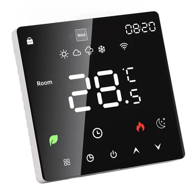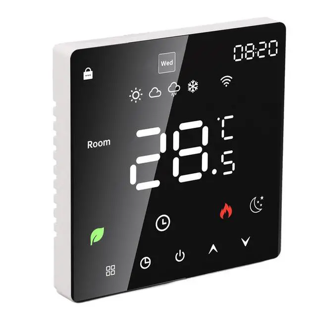 1. Touchscreen LCD Display: The smart thermostat is equipped with a color touchscreen LCD display, providing clear visibility of current room temperature, set temperature, operating modes, and more, ensuring intuitive and convenient operation.