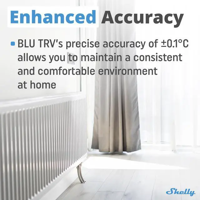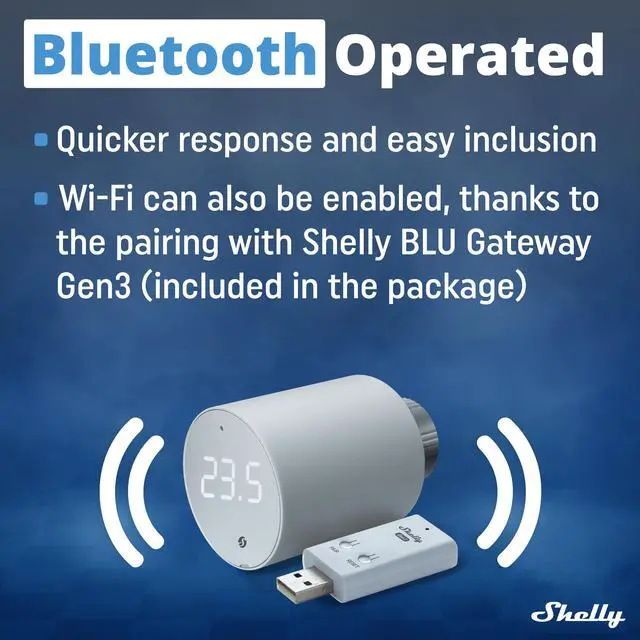 Shelly BLU TRV is a smart thermostatic radiator head with Bluetooth & Zigbee connectivity. It controls the temperature of a room by changing the flow of the hot water through the radiator. If needed, the temperature can be changed at any time by turning the Device rotating knob to the left or right, or through your mobile phone, tablet, or PC. The Device can also maintain the room temperature according to a set weekly schedule. It is powered by 2 AA, 1.5 V batteries.
